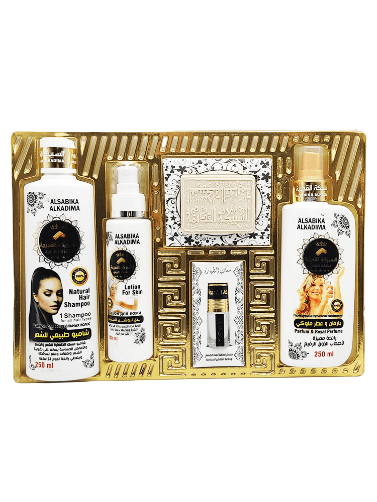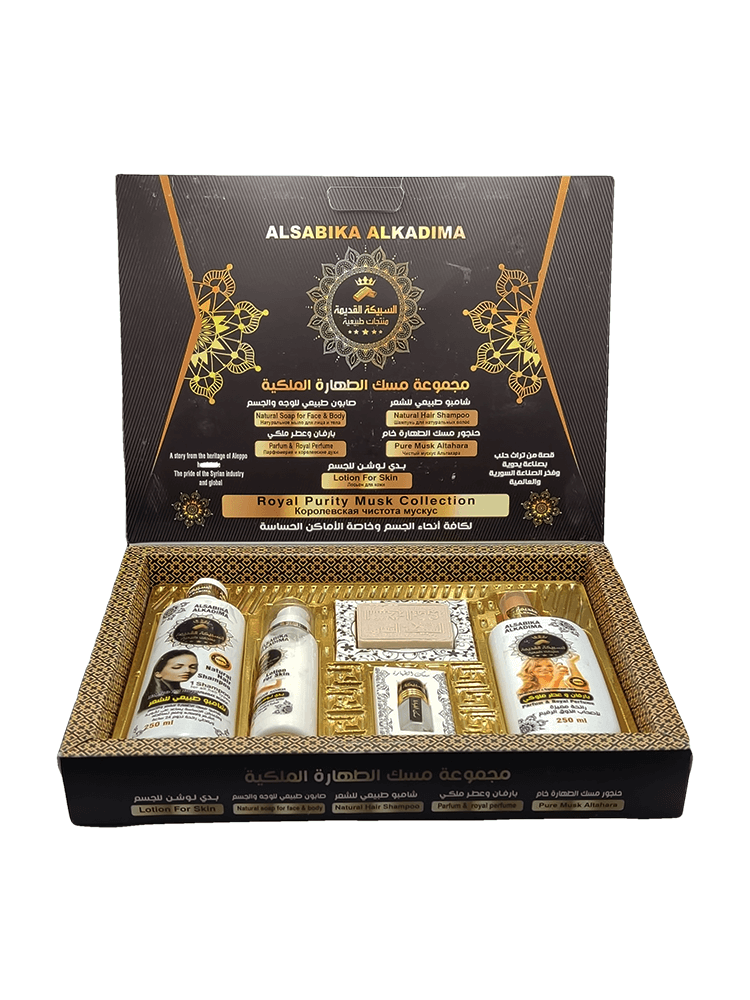 شامبو طبيعي للشعر وصابون طبيعي للوجه وحنجور مسك الطهارة وبارفان (عطر) ملكي و بدي لوشن (مرطب جسم)